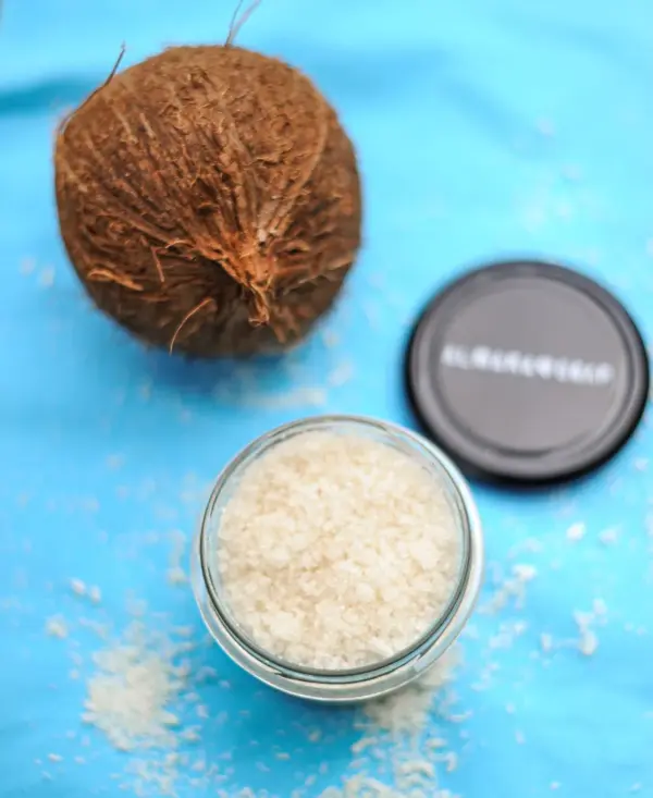zucchero di canna biologico chiaro, olio di mandorla, olio di cocco bio e fair trade, aroma natural, cocco grattugiato