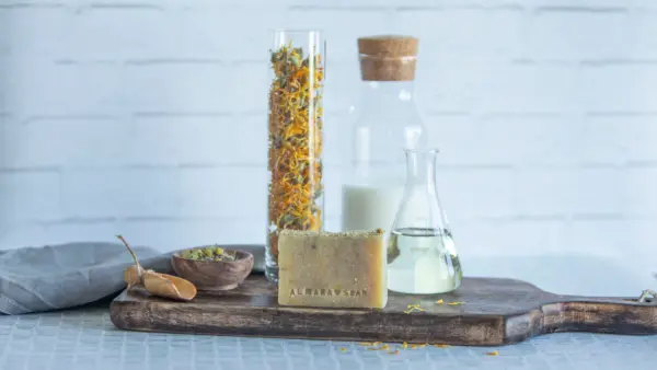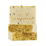Sapone profumato splendidamente fresco con fiori ed estratto di camomilla e calendula, contiene latte di cocco e avena colloidale calmanti e oli essenziali di tea tree e mirto che sono famosi per i loro straordinari effetti antibatterici.