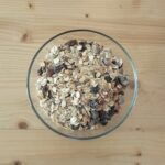 Miscela di fiocchi di cereali e frutta essiccata per una colazione completa e naturale.